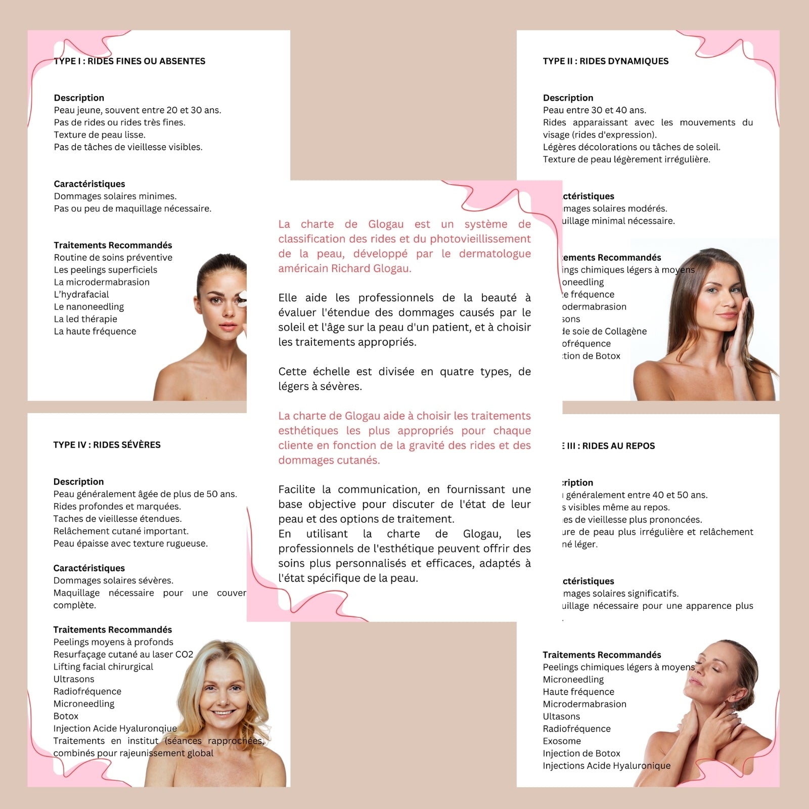Évaluez facilement le degré de vieillissement cutané de vos clientes grâce à la charte de Glogau, un outil indispensable pour un diagnostic précis et professionnel.