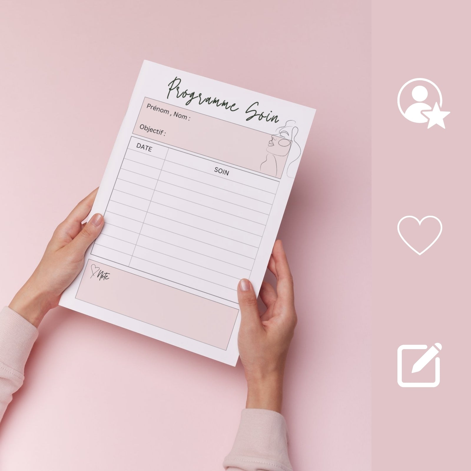 Créez un protocole personnalisé pour chaque cliente grâce à ce programme soin prêt à imprimer. Idéal pour noter les étapes du soin, les produits utilisés, les recommandations et les objectifs beauté.